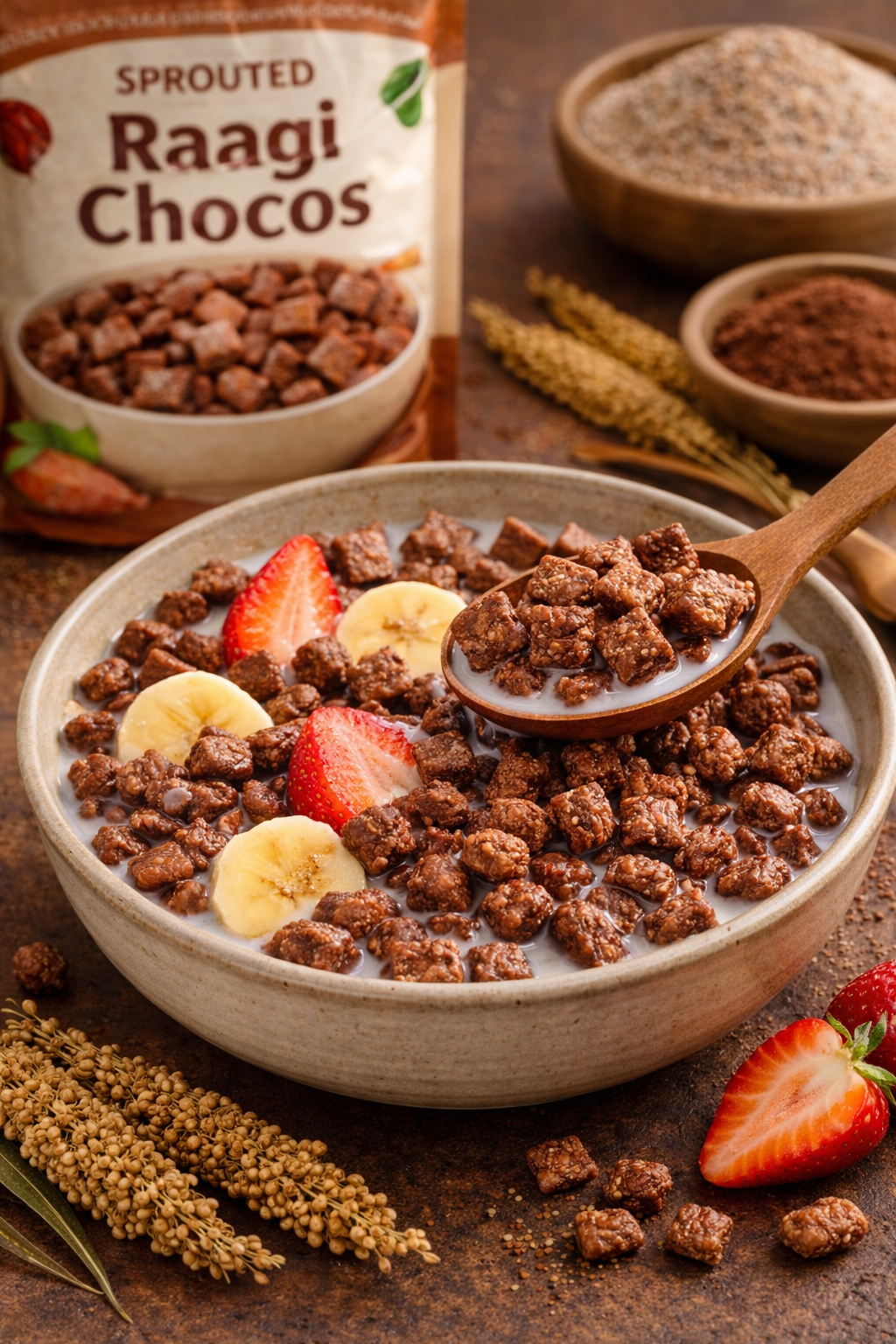 Made from nutrient-rich sprouted finger millet (raagi), our Sprouted Raagi Chocos are a crunchy, wholesome alternative to regular breakfast cereals. Lightly sweetened and roasted for a natural crunch, they are rich in calcium, fiber, and plant-based protein. Designed as a healthy breakfast or anytime snack, these chocos support sustained energy without artificial colors, preservatives, or refined sugar.